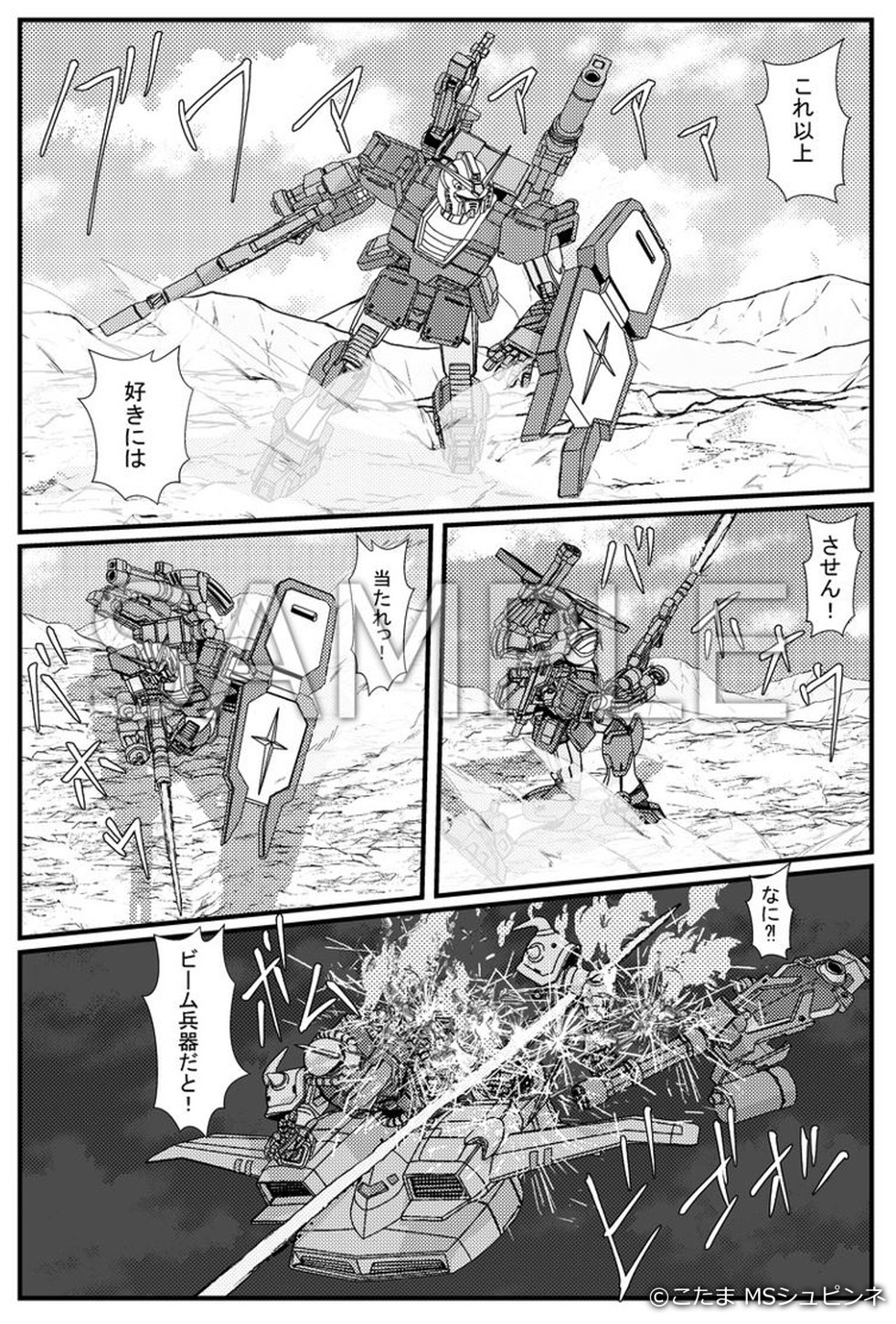 しかもFSDはガンダムの先行量産機であるため機体は複数あったはずなので、外伝漫画「ククルス・ドアンの島」に登場した機体とは別の機体として同人誌へ登場させることにしました。